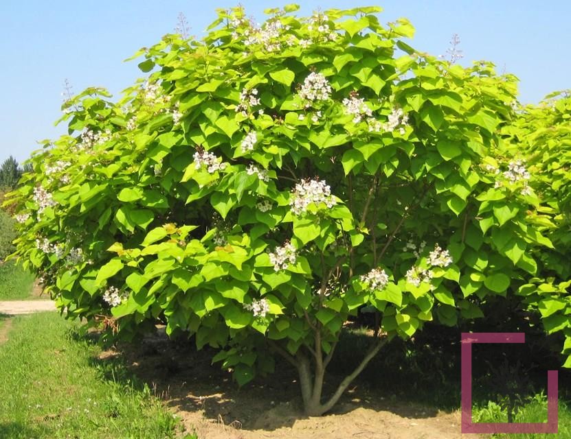 La catalpa bignonioides أ¨ un albero ornamentale di medie dimensioni a crescita rapida, raggiunge i 15 m di altezza. pianta con chioma rotondeggiante, caratteristica per le grandi foglie, la vistosa fioritura e i lunghi frutti chiamati sigari. le foglie sono molto grandi, circa 25 cm, ovali-cordiformi, leggermente lobate, verde chiaro e pubescenti sulla pagina inferiore. le infiorescenze, a grappolo eretto, sbocciano a giugno-luglio e sono costituite da fiori campanulati bianchi punteggiati di giallo e rosso. i frutti sono capsule lunghe da 15 a 40 cm, simili a baccelli, dapprima verdi poi marroni, e persistono sulla pianta sino alla fioritura dell’anno successivo.