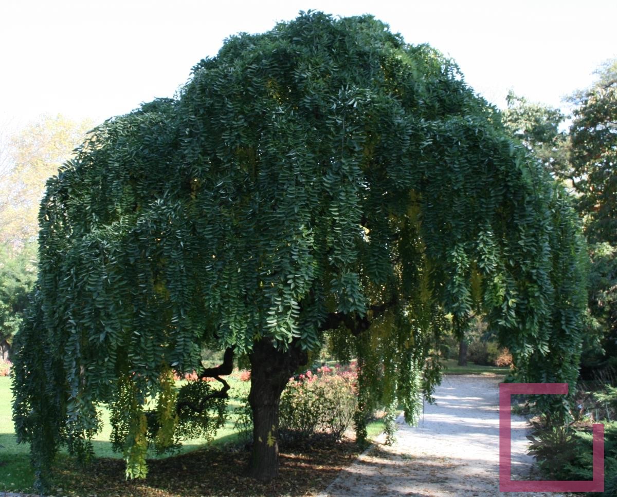 Pianta mesofilo-termofila originaria della cina e della corea. chioma cupolare, nei giovani soggetti i rami scendono regolarmente sino al suolo. con gli anni, rami secondari si formano e formano diversi piani penduli conferendo all’ insieme della chioma un aspetto pittoresco. albero alto fino a 5 metri. il tronco, diritto o sinuoso, ha una scorza grigio-bruna percorsa da solchi longitudinali. foglie decidue, di colore verde scuro, picciolate, alterne, imparipennate, lunghe fino a 25 cm, con 7-13 segmenti ovato-acuti lunghi 5 cm, a margine intero, piأ¹ chiari nella pagina inferiore. fiorisce poco o per niente e i fiori sono ermafroditi, gialli o biancastri, riuniti in infiorescenze racemose.. il frutto أ¨ un lomento cilindrico, strozzato fra i semi, prima verde quindi giallo-bruno, ricco di polpa trasparente; i semi sono globosi. e' una specie ornamentale molto apprezzata per parchi e giardini per il suo portamento elegante.